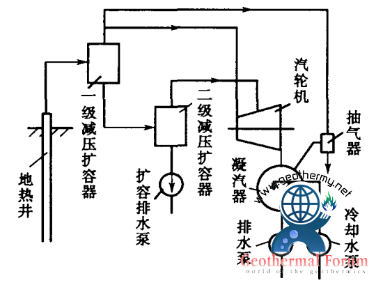 地熱田所提供的地熱蒸氣或熱水的參數(溫度、壓力),相對于常規火電廠的參數來說都是很低的,地熱發電的效率也遠低于火力發電。因此,如何最大限度地利用地熱能量,尤其是對濕蒸氣田和熱水田更是突出的問題。采用多級閃蒸系統,就是一種有效利用地熱能量的方法。