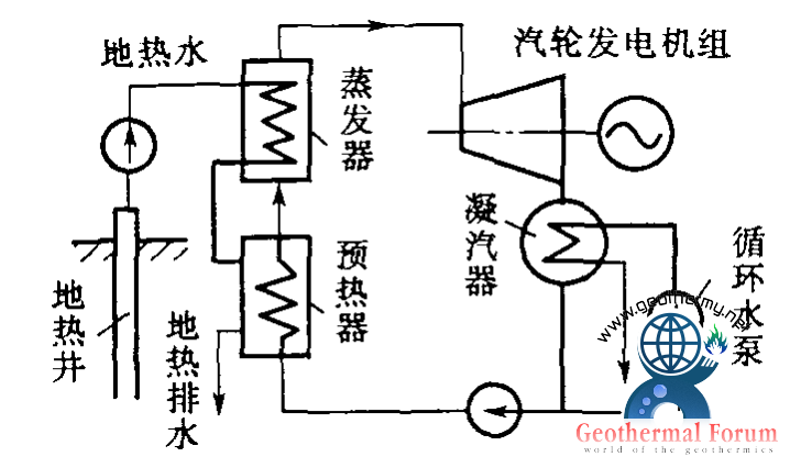 雙循環地熱發電系統是利用地下熱水來加熱某種低沸點工質,使其進入汽輪機工作的地熱發電系統,又稱中間介質法或低沸點工質循環。它是為克服閃蒸地熱發電系統的缺點而出現的一種循環系統。地下熱水用深井泵抽到地面進入電站內的蒸發器,加熱某一種低沸點介質(如氟里昂11、氯乙烷等),使之變為低沸點介質蒸氣,然后通入汽輪機做功發電,汽輪機排出的乏汽經凝汽器冷凝成液體,用工質泵再打回蒸發器重新加熱,循環使用。為充分利用地熱水的余熱,讓從蒸發器排出的地熱水經過一個預熱器先預熱來自凝汽器的低沸點工質液體,使其溫度上升至接近蒸發器內的工質飽和溫度,再進入蒸發器。為了保證從地熱井來的地熱水在輸送過程中不閃蒸成蒸氣和不使溶解氣體從水中逸出,在管路中的熱水始終保持超過其溫度對應的飽和壓力。