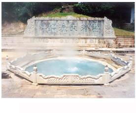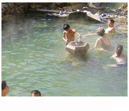 在諸泉中,最有特點和傳奇色彩的要數“仙人澡塘”。在一塊高出河面約25米的巖石上,共有3潭泉水:大的面積約為4平方米, 小的面積分別為0.4和0.5平方米,相隔僅20厘米,卻一冷一熱, 熱的溫度高達95攝氏度,冷的只有20攝氏度。